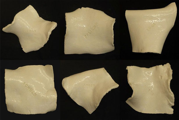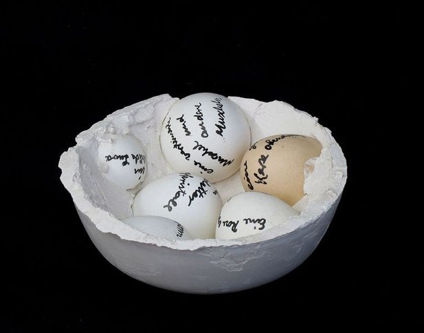 Das Wort auf den Eiern, Eierschalen/ Gips/ Tusche, ca. 5 x 13 x 13 / 1995
