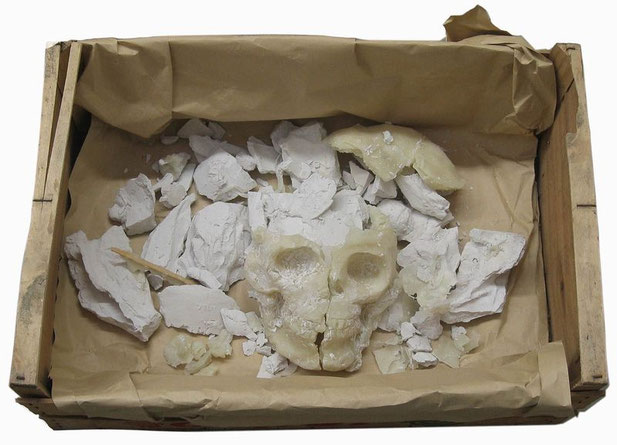Früher/ Später, Wachs/ Gips/ Papier/ Holz, ca. 20 x 60 x 40 / 2002